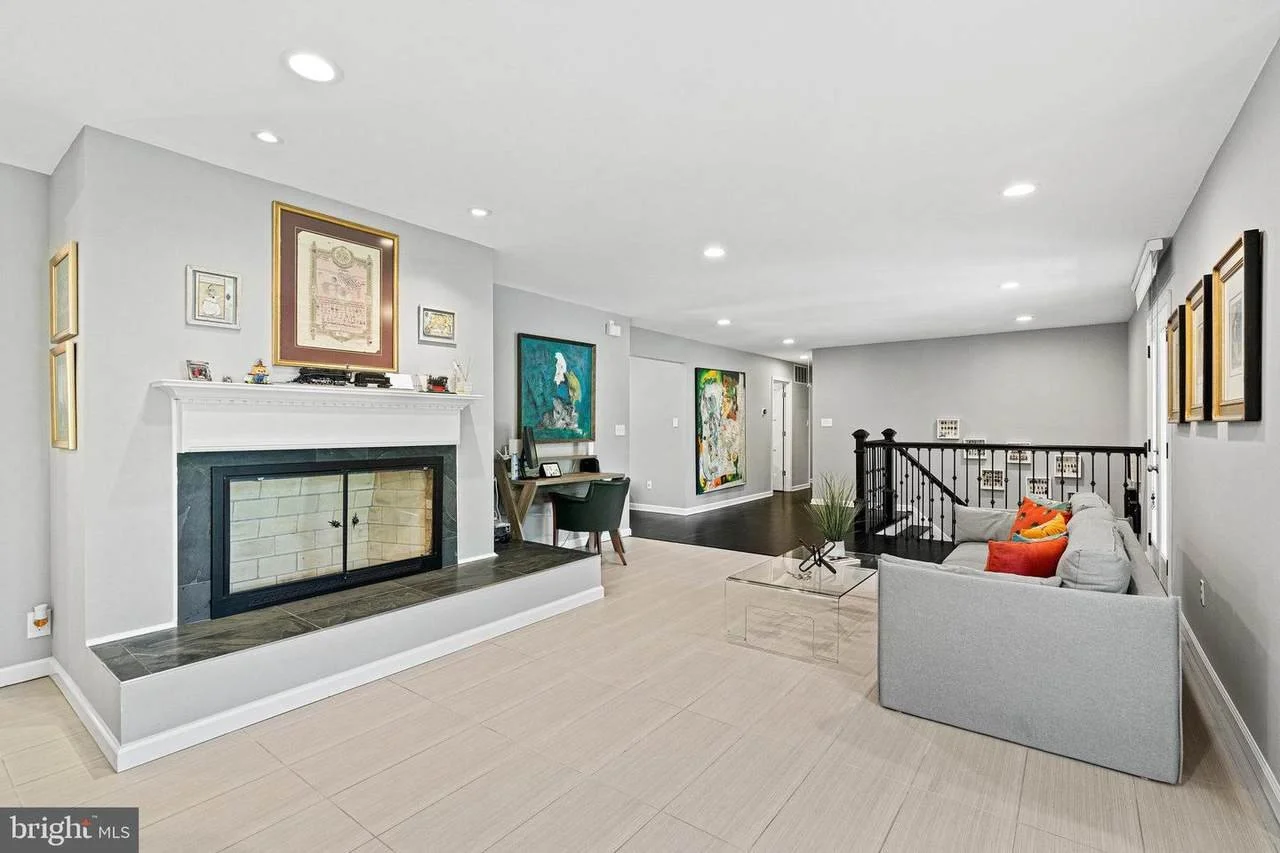 The upper level showcases a seamless flow between the kitchen, living room, and dining area.The inviting living room offers a second wood-burning fireplace and French doors leading to a charming balcony, perfect for enjoying fresh air and relaxation. The gourmet kitchen is a culinary enthusiast's dream, featuring custom white and soft-close Shaker cabinets, high-end Kitchen Aid stainless steel appliances, including a 5-burner induction heat cooktop and double oven, stunning quartz countertops, a subway tile backsplash with an accent wall at the cooktop, and an extra deep sink. The oversized kitchen island provides ample space for meal preparation and boasts convenient USB and electrical outlets.